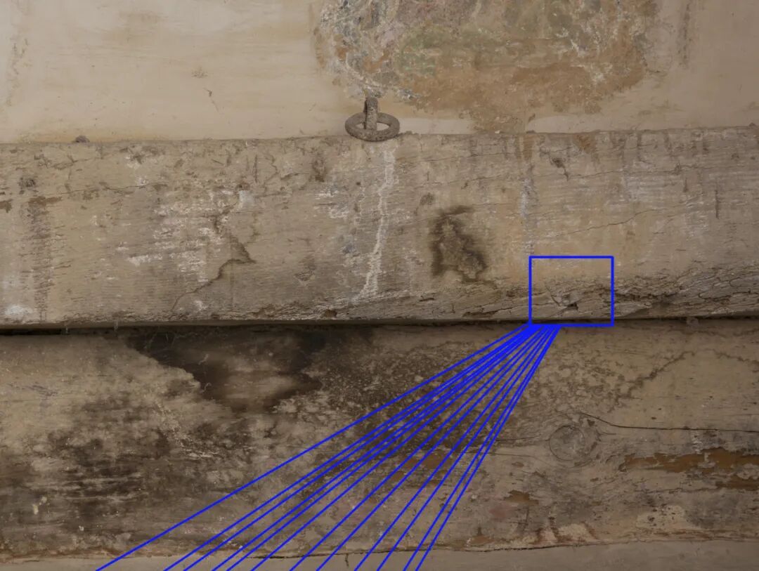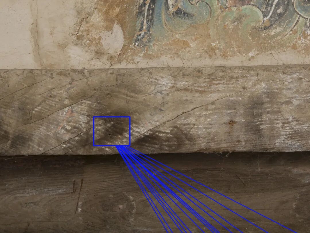 尤其值得注意的是,这两个控制点并非虚拟的参考点,而是真实地存在于建筑当中的。左右两侧的斜线延长线各交汇于一点,这两点恰好位于普拍枋的侧面。在开化寺现场可以清晰地看到,在这些斜线交汇的位置上有两个圆孔,圆孔直径约2毫米,似乎是钉孔(图13)。这一发现从物质层面上为两个斜线控制点提供了佐证:钉孔的存在,说明它们可能参与了实际的绘图过程。两个控制点的操作方法也因此有了一种可能的解释:先在普拍枋上钉两枚钉子,在钉子上固定墨绳,再不断旋转移动墨绳,就可以轻易地确定多条汇聚于一点的斜线。这样的操作既便于控制构图也便于工匠绘制斜线,尤其是对于大尺度、复杂的建筑图像而言,这种方法避免了绘制平行线产生的误差,从而更易获得整体构图的统一性。这两个汇聚点除了创造出画面中的远近感之外,更为实际操作提供了便利,使得整幅画面“向背分明,不失绳墨”。