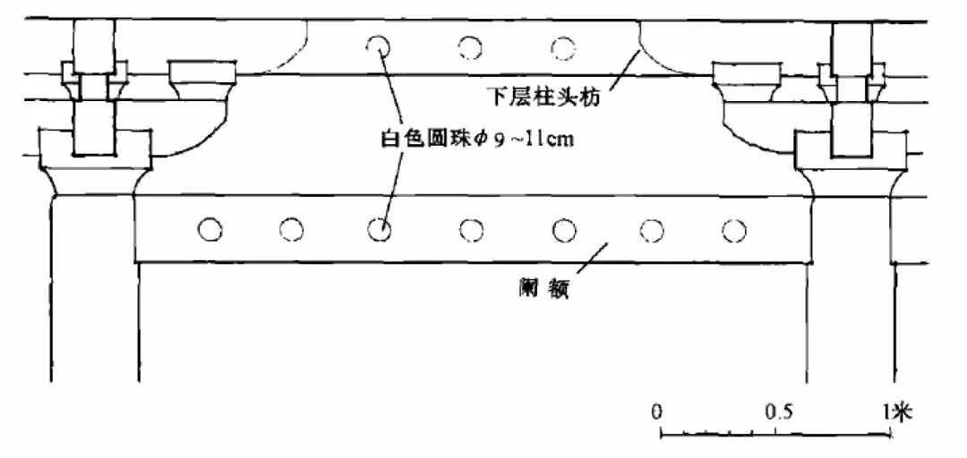 e)南禅寺大殿阑额与柱头枋内侧白色圆点装饰