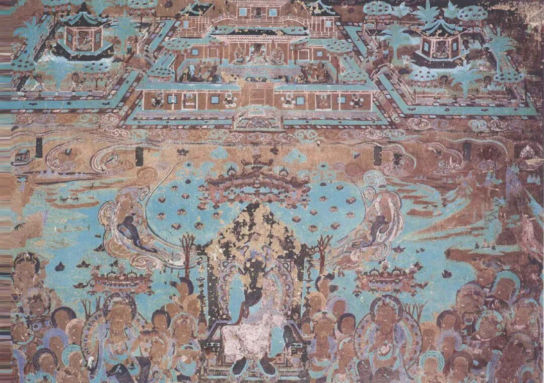 上述实例与北壁东画面最大的差异是院落中央的水池,经变画中弥勒菩萨说法所在的院落以水池为中心展开,经文中也有大量关于水渠和渠中八味水的描述:“一八色渠,八色渠者,青黄赤白红紫碧绿,二宝珠合成,三八味水,即前八色皆悉具足。”水的元素也经常出现在其他弥勒经变和西方净土变的建筑场景中,可见水池是构建天宫的重要元素。