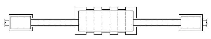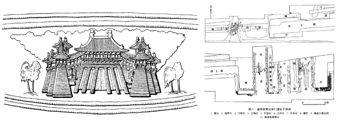 壁画中央城楼为单檐歇山顶,面阔三开间,在城墩顶上架设木平坐层,平坐层上再建城楼。中央城楼两侧另有两座朵楼,之间以连廊相连,朵楼同样为单檐歇山顶,面阔三开间,山面朝前。该组城楼与朵楼的形式与北宋东京皇城南面的宣德门有一定的相似之处,但建筑等级及复杂程度有所降低。此外,该处城楼在平面布局方面与宣德门亦有明显的不同:开化寺壁画城楼与两朵楼呈“一”字型布局,而宣德门与朵楼则呈“凹”字型布局。同样呈“一”字型布局的还有唐宋时期位于洛阳城郭城南面正中的定鼎门,定鼎门遗址同样是一门三道、两侧配有朵楼、没有阙楼(图6),有可能为开化寺壁画“天宫城楼”图像创作的蓝本。