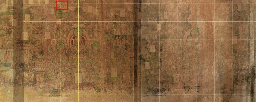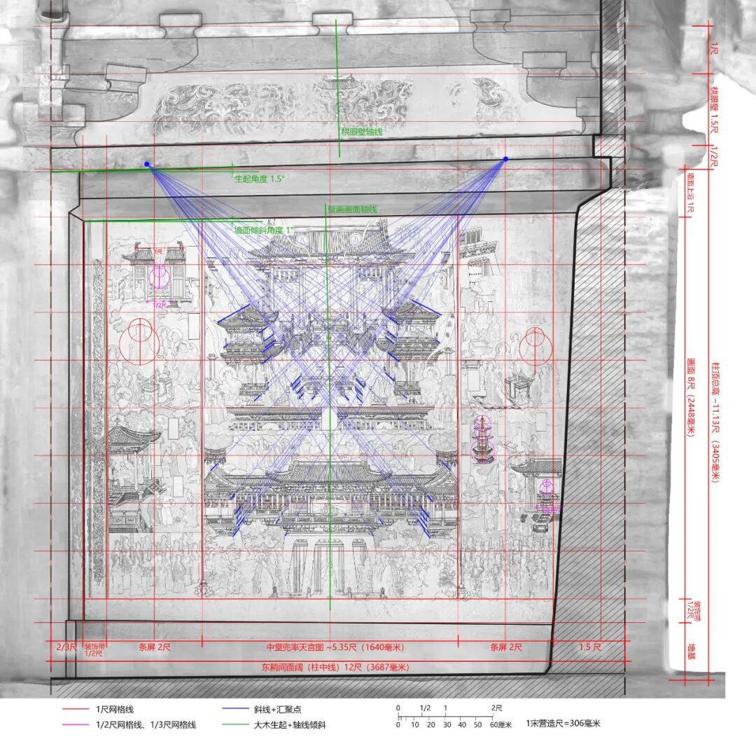 运用正交网格控制画面布局的方法,在早期文献中可见于《画继》对郭忠恕的描述:“郭待诏,赵州人,每以界画自矜云:置方卓令众工纵横画之,往往不知向背尺度,真所谓良工心独苦也。不记名”,其中“置方卓”即指以方格控制线来统筹画面。这一控制方法在近年的宋元壁画研究中得到了印证。王卉娟博士发现永乐宫纯阳殿壁画中可能运用了37厘米×44厘米的控制画格。王赞教授也在开化寺西壁上发现了46厘米×46厘米的网格控制线,并有画面底层赭石色的线痕作为佐证。