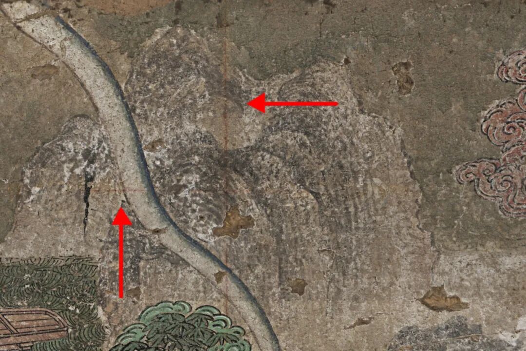 王赞教授在对大殿西壁的调查中发现了对应1.5尺(460毫米)网格的赭石色墨线,从物质层面上证明了开化寺壁画绘制过程中网格线的存在(图12),但1.5 尺的网格似乎并不适用于北壁东。1尺网格在北壁东侧既顾及到了大木的整体尺度,也考虑了画面中建筑的结构控制线,具有高度的整体性。这说明北壁东和西壁可能使用了不同的网格控制体系,也从侧面佐证了大殿内壁画由多个不同的绘制团队完成。