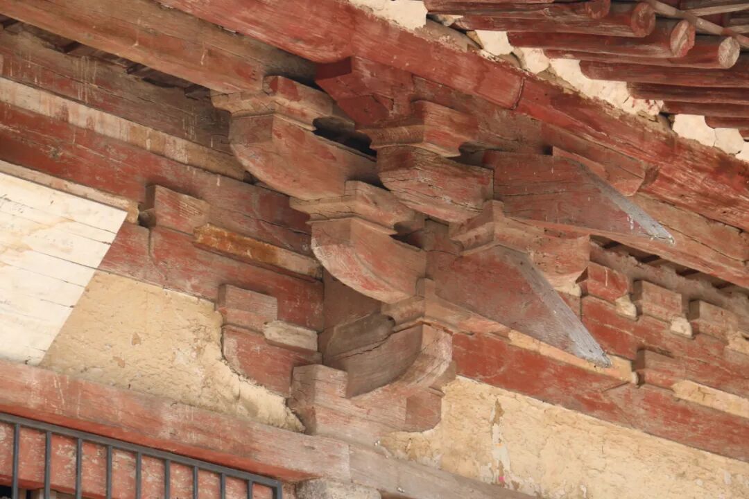 画面上方大殿前设置左右两条辇道,辇道上装饰红色卷成华文。各殿台基和平坐层上均设置栏杆,为华版式单钩阑,由枓子蜀柱承托寻杖,盆唇与地袱之间安置华版,华版上绘制铺地卷成华文装饰,钩阑尽头、转角处设置望柱,望柱柱头呈莲花状。城门道内使用板门,城楼上使用牙头护缝软门,上半部分为龟背文格子,中间使用腰串,下半部分障水板用牙头护缝。檐下有软帘垂下,并以金色的帘钩卷起(图7),钩阑、门窗的做法都与《营造法式》小木作的做法相符,是理解《营造法式》 做法的重要图像参照。在画面中部的连廊中可以清晰地看到梭柱的柱头卷杀,顶部的三开间大殿使用了瓜棱柱(图7),均为现实中北宋建筑立柱的重要特征。兜率天宫的几座主体建筑中还体现了重楣加蜀柱的做法,此形式常见于唐代建筑,在现存的北宋木构中十分少见。这幅壁画里重楣与普拍枋同时存在,普拍枋上还饰有均匀分布的白色圆点作为彩画纹样,类似的纹样同时见于南禅寺大殿阑额与柱头枋内侧(图8)。画面中的斗栱用四铺作卷头造,或五铺作单杪单下昂、耍头做昂形,五铺作斗栱形制与开化寺大殿外檐斗栱相似,体现出建筑画对现实中建筑的模仿(图9)。值得注意的是明间正中补间铺作左右出45度斜栱,使得较宽的明间位置显得更加饱满。
