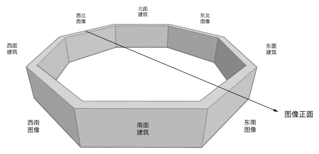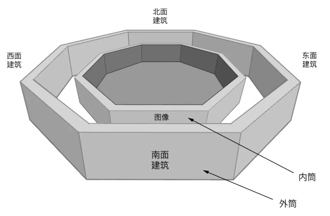 笔者认为闸口白塔雕刻的图像与建筑可比拟为实际内外双套筒的结构关系,也就是将四个(建筑)正面视为在塔外,四个(图像)隅面在塔内(图29)。这八个面建构出塔内外之间的想象空间,提供给观者在随着第一层供养菩萨绕塔时,可以想象进入佛塔中,然后从最底层登级的可能性。先登上第三层逐一向四佛礼拜,再上至第四层,绕塔至东南面礼拜毗卢遮那佛以及胁侍的文殊和普贤三尊像,接着逐层礼佛旋绕往上,直到第八、九层,随着镇护石塔的天王与龙王绕行佛塔。闸口白塔的特殊尺寸以及繁复却有系统的图像,提供观者在绕行佛塔之际如此这般想象的可能性。再者,仿木构精准细致的表现,也增强绕行者模拟实际绕塔经验的真实感。