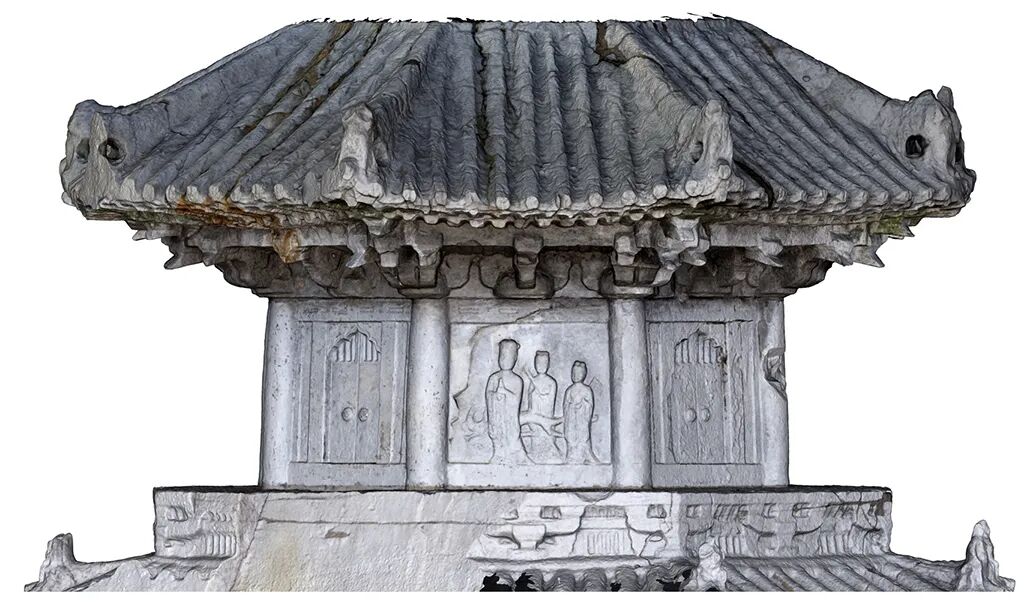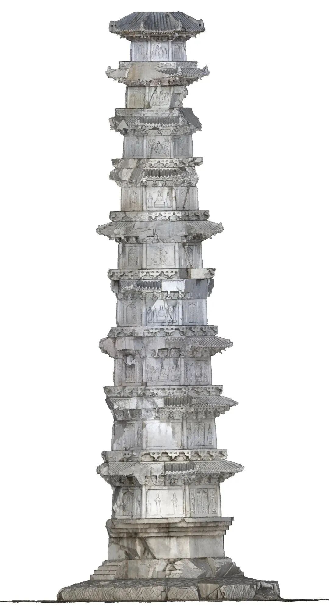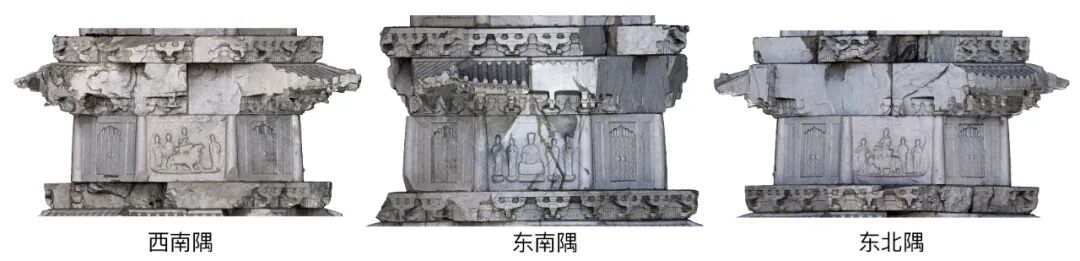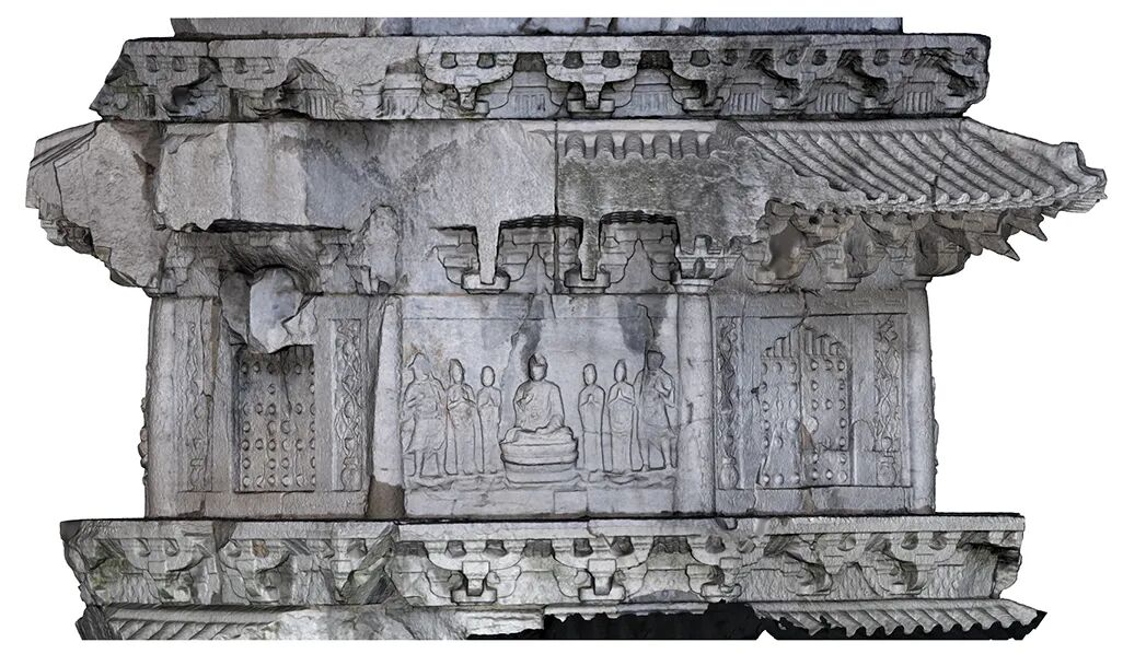 近年来浙江大学文化遗产研究所对闸口白塔进行了三维图像扫描(图2),使我们对塔身的图像程序有了更进一步的认识。基于该塔图像的内容,尤其是佛塔建筑与图像之间的关系,本文认为闸口白塔虽然尺度较小,没有内部空间,但其佛塔功能和宗教意义与同时期砖石佛塔相仿,都是吴越地区晚期佛塔崇拜之风的产物。研究闸口白塔,就不能将之抽离出吴越佛塔整体的发展脉络。因此,本文的讨论并非局限于闸口白塔,而是从两个不同的研究视角出发:首先着眼于营造技术和材质,再将闸口白塔置于当时佛教、图像以及宗教视觉文化交替互相影响的历史语境之中,分析闸口白塔的结构与空间如何塑造它的宗教功能和意义。期待这样的研究方法对研究吴越时期砖石佛塔起到启示作用。