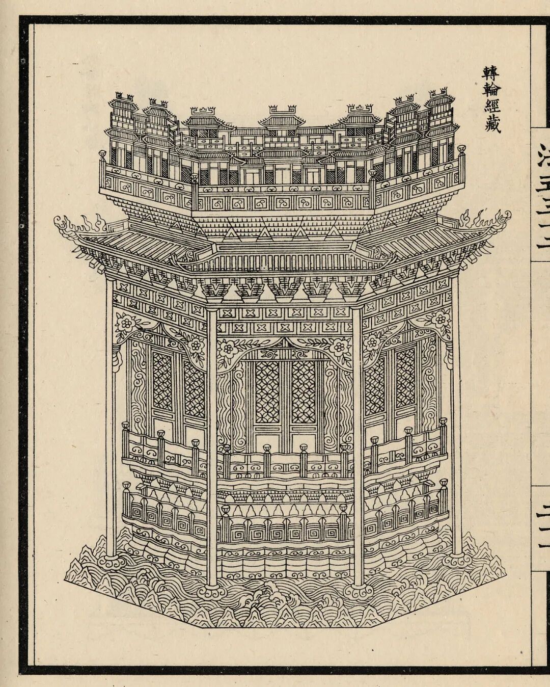 有关吴越佛塔塔内瘗藏文物,已经坍塌的雷峰塔提供了至今最为清楚可靠的材料。建于972 年的雷峰塔是一座八角五级木檐砖身楼阁式塔,2000—2001 年遗址发掘时展露了东侧保存较好的塔基基座,形制为双重石砌须弥座,表面雕刻“九山八海”纹饰(图33)。塔基土衬雕刻“九山八海”纹,是吴越佛塔的特征之一,但现存的例子多见于石塔或铁塔等尺度较小的塔,而非实际佛塔。北宋李诫于《营造法式》“石作制度”中提到“土衬……外周四侧作起突宝山,面上作出没水池”。但形制与吴越地区所见“九山八海”纹更为接近的是卷三十二中“转轮经藏”的图样(图34),属小木作的范畴。《营造法式》成书于北宋末期,不足以代表这类波浪纹在吴越时期使用的状况,但雷峰塔将双重基台表面雕刻成“九山八海”纹样,很有可能是参照了当时尺度较小、并同在杭州的闸口白塔或灵隐寺双塔。纹样也可以作为实际佛塔以小塔为参照的间接证据。