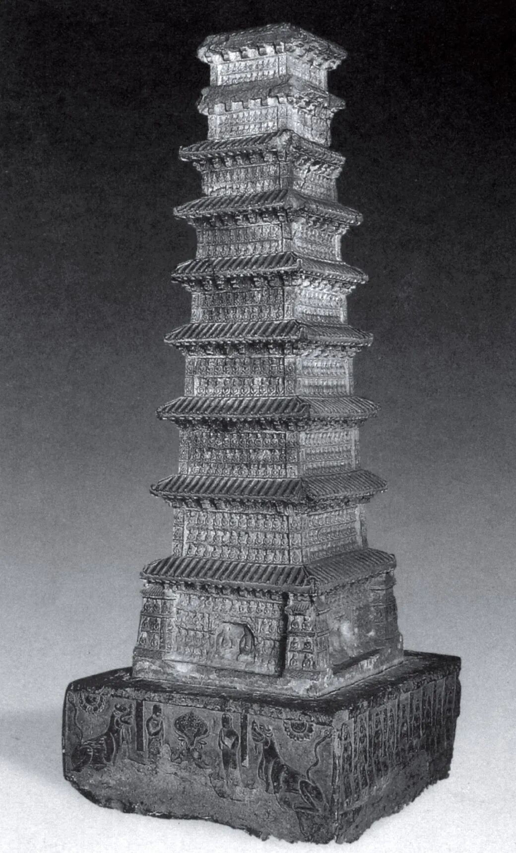 魏晋南北朝以来,确实有无数雕刻着不同佛像题材的石塔(图39),但实际上佛塔通常只在塔身局部造像以为装饰,从未在塔身如是满布浮雕造像。早期高层佛塔,如北魏洛阳永宁寺塔(图40),仅在一层塔内设像,塔身无佛像装饰。但这不妨碍佛教徒出资供养塔身满布佛像的小佛塔——一种在实际造塔时仅存在于想象中的理想模式。在中国中古时期的宗教视觉语言中,这种表现十分常见,举例来说,敦煌经变画对讲经法会的描绘,一般都将佛、胁侍菩萨和众多的供养菩萨画在佛殿外的露天空间而非佛殿之内,众人聚精会神地听佛讲说佛法。人们不会将壁画中的视觉表现误作现实,但在佛教语境中,这些经变画将观者脑中的“视觉想象”外化,同时也赋予实际佛寺建筑更丰富的宗教意义。