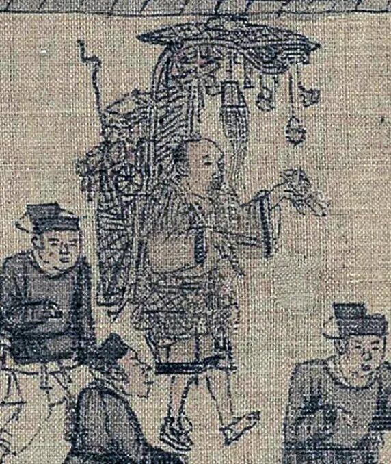 吴越国时期的10世纪正是“行脚僧”图像流行的时期,与当时佛教求法、传法活动的活跃不无关系,学者已多有讨论。特别是玄奘取经逐渐成为行脚僧的原型,被加以神格化,出现在特定求法场景的佛教图像中,敦煌壁画和藏经洞出土的材料中都可见到。其实,“行脚僧”作为绘画题材,唐代早已出现,《历代名画记》有唐长寿寺佛殿吴道子所绘“行僧像”的记载。到了五代北宋初年,行脚僧也被单独作为图像母题(motif)使用,如北宋开封繁塔有作为供养使用的行脚僧像(图31),并刻有建塔捐献者姓名和年月。另一方面,北宋张择端《清明上河图》中也描绘了行僧的形象(图32),反映当时常可见到游方求法的僧人,表现的不是求法,而是僧人在喧嚣市井中“行走”的含义。出现在闸口白塔建筑中心的行脚僧,缺乏取经求法相关元素的组合,当是单纯的供养图像。其面朝西,呈行动姿态,从整座塔的图像组合和配置视之,更像是一位正在绕塔而行的僧人,与白塔上其他动态性图像的动向一致,似乎在闸口白塔虚拟的想象空间中,替代仅能在地面绕塔的观者,逐层礼拜诸佛像,绕行而上。
