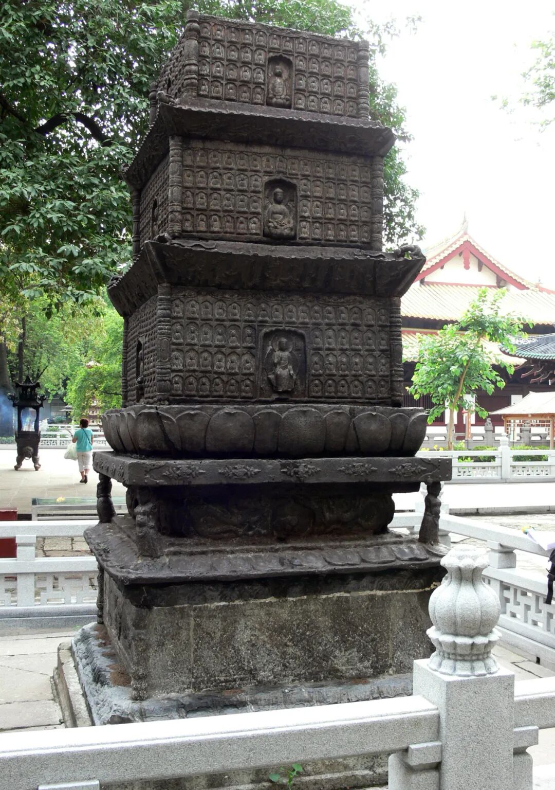 有关佛塔建筑与图像的关系,另有与闸口白塔同时期建造之铁塔可供参考。义乌双林寺东铁塔建造于后周广顺二年(952),现仅存底部基台与两层塔身,复原后应为八面七级楼阁式塔,通高约6米(图27)。基台刻“九山八海”纹图样,第一、三、五、七层四正面开壸门,四隅面上则有9 尊坐佛。第二、四、六层则各面皆为坐佛,每面12尊,无建筑细节图像。整体来看,佛像之间没有特殊图像关系,也不存在图像与佛塔建筑之间的复杂关系。另一同时期实例为南汉时期广州光孝寺东西铁塔,为四面七级楼阁式塔,每层每面中央有一大龛供一佛,其余空间则布满供有坐佛的小佛龛。其中东塔一层四面的四佛分别为释迦牟尼、阿弥陀佛、弥勒佛、药师佛(图28),与闸口白塔第三层的四佛相同。然而,光孝寺塔仍是五代以前的做法,在塔身上雕饰千佛,不追求图像与建筑之间的特殊关联。闸口白塔的建造者舍弃了上述两种普遍的做法,呈现出特定的图像空间布置,以及图像与佛塔建筑关系的特殊性,定非出于偶然。