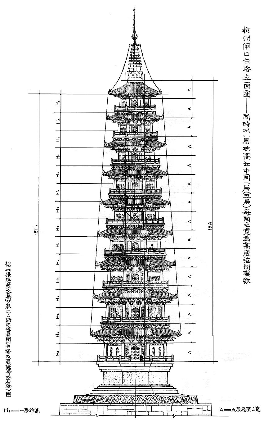 刘敦桢于1936年至苏州考察古建筑,实地调查了该地区吴越时期的罗汉院双塔、云岩寺塔以及北宋的瑞光塔和报恩寺塔。1937年梁思成和林徽因也专程至杭州考察了闸口白塔和灵隐寺双石塔,这两次考察开启了国内学者吴越佛塔建筑研究之先河。新中国成立之后的历次调研工作全面梳理了现存吴越佛塔年代、建筑形制、特征及分布状况,不但增加了确知吴越佛塔的数量,通过建造形制的比较和年代排比,也大致勾勒出吴越佛塔的历史轮廓,近年来更不乏杰出的研究成果。在此基础上,学界对吴越佛塔的理解不断丰富完善。但整体上,吴越佛塔建筑研究的重点,仍未脱离其砖石仿木构的特征,但如果仅着眼于此,将无法充分回答上述闸口白塔尺度的问题。