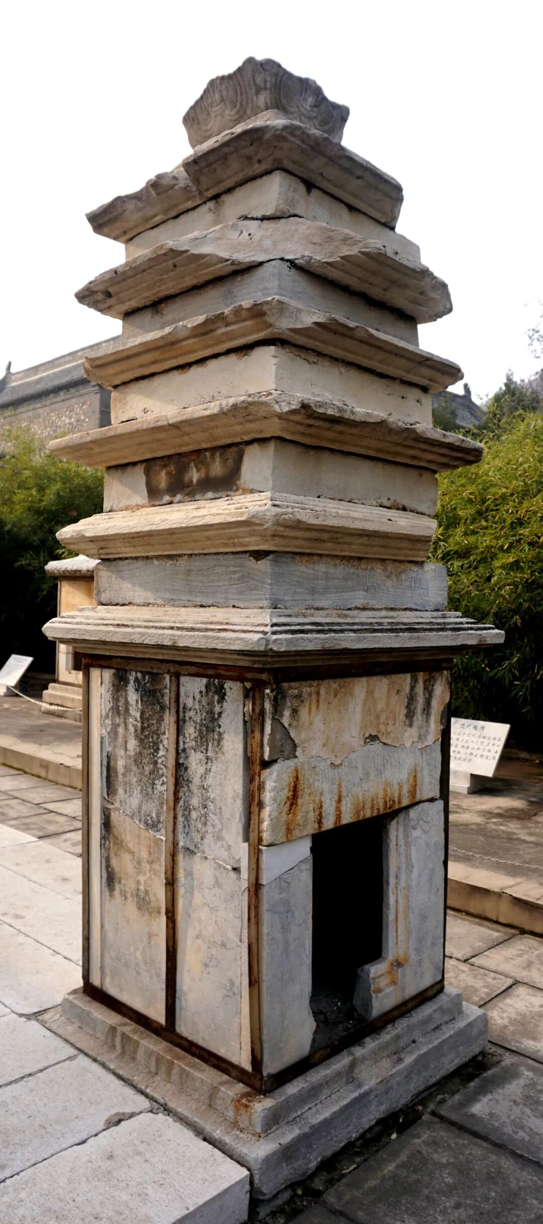 其实,“木塔作为其他材质塔的原型”这一论断其来有自。早期佛塔以木构为主,最晚在北魏时期就可见“仿木构”石塔的零星记载,隋唐沿袭北魏造塔之风,长安城内就有高层木塔数座,但缺乏更详细的记载。找寻隋唐时期高层木构建筑成就的例证,只能求助于同时期的楼阁式砖塔,比如,西安大慈恩寺塔(大雁塔)、兴教寺玄奘法师墓塔(图3),或是具密檐特征的香积寺塔(图4)等,将其视为对当时楼阁式木塔形式的模仿。五代、宋、辽时期则是另一个佛塔蓬勃发展的历史阶段,但绝大多数木构未能保存至今,遗存的砖石楼阁式塔,顺理成章地成了学者窥探当时楼阁式塔造型与风格的依据。如罗哲文所说:“从盛唐开始模仿木建筑的结构样式,影响到宋塔的形制。”