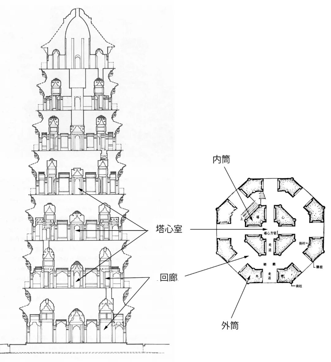 入宋之后,吴越旧地所建造的砖石佛塔又有了新的变化,可视为前期基础上的发展。苏州瑞光塔(图13),建于北宋景德元年至天圣八年(1004—1030),为八面七级木檐砖身塔,属于双套筒结构,塔的首层设副阶,但塔内第一至第五层不设塔心室,而是用砖砌实心塔心与塔身外壁用砖叠涩相连,构成回廊的顶棚和楼板。第六、七层的塔心室则是相连的垂直空间,中央立塔刹柱,支撑塔顶塔刹。虽与之前讨论的连续塔心室的做法不同,但两者所透露出的强调佛塔中心竖向轴线的思路一脉相承。瑞光塔塔内回廊两壁加开佛龛,入塔可绕行礼佛,在之前仅有回廊的基础上又进一步。