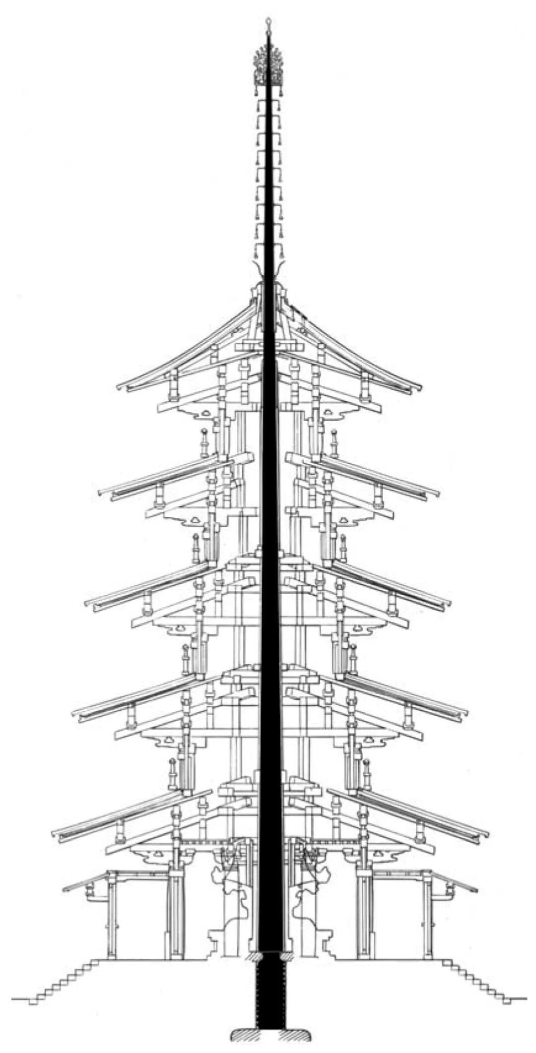 采用双套筒出自稳定结构的需要,也因此大体决定了塔内空间的构成。内外筒之间的空间自然形成了回廊,内筒之内也合理地在每层中形成了前所未有的“塔心室”。早期木构佛塔中多建有塔心柱,标识佛舍利所在的神圣中心,为佛塔地面以上最关键的象征性构件。从日本奈良现存法隆寺五重塔(图9)、法起寺三重塔等例子窥知,塔心柱贯穿塔身,占据绝大空间,直通塔顶覆钵处,支撑塔刹。一层作为礼佛空间,以上各层由于没有可使用空间,不设楼板或楼梯供登楼使用。但初唐之后,在关于楼阁式高层木塔有限的文献中,不再见塔心柱的做法,唐代遗存的方形佛塔似乎也不用塔心柱。唐代砖塔塔体结构大致分为厚壁中空式(即单筒结构)和实心式,塔顶皆有塔刹,实心塔中是否建有塔心柱并不明确,但中空式则多用楼板分隔出内部楼层,不见塔心柱的做法,吴越早期的功臣塔亦是如此。而云岩寺塔中塔心室的出现,虽不与塔心柱完全等同,似乎可以视作有意识的回归,重新强调中心塔柱在佛塔中的象征意义,这从剖面图中可窥知一二(图7)。