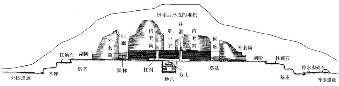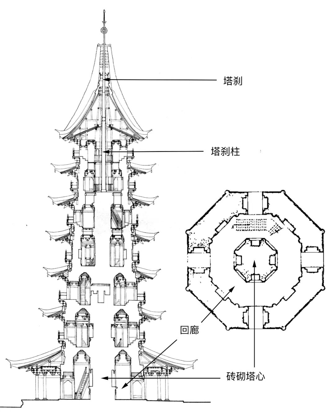 图13 苏州瑞光塔(1004—1030年)剖面图与首层平面图