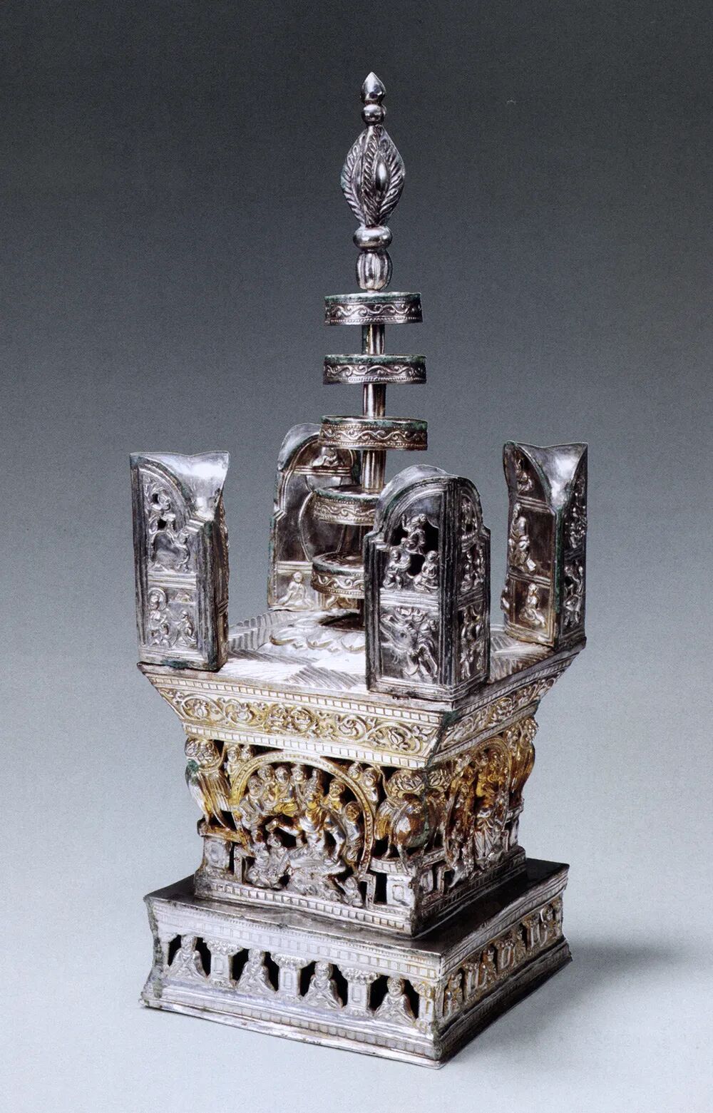 文中阿育王塔的材质、造型、尺寸以及塔身图像,与已知的金涂塔实物相似。以钱俶所建雷峰塔地宫中所出的鎏金纯银阿育王塔为例(图15),塔身方形,塔顶四角有四根山花蕉叶,正中立刹,五重相轮。塔身四面镂雕图像,各个人物的确“面目手足咸具备”。虽说图像内容并非《法苑珠林》所说的“诸佛菩萨金刚圣僧杂类等像”,但若说钱俶所铸金涂塔是以传说中的阿育王塔为范本,似乎也不为过。更重要的是,文末称刘萨何所发现的阿育王塔之后供奉在“大木塔内”,塔名为鄮县塔。道宣《广弘明集》中也有关于该塔的记载,亦称阿育王塔最终供养于“木塔”中。对效法阿育王的钱俶而言,似乎有意模仿文献中的记载,选择南北朝时期的木楼阁式塔,作为他所主持铸造阿育王塔的最终瘗藏之处,同时以砖石替换木材质,以期佛塔永固。对于这一问题,后文将再讨论。