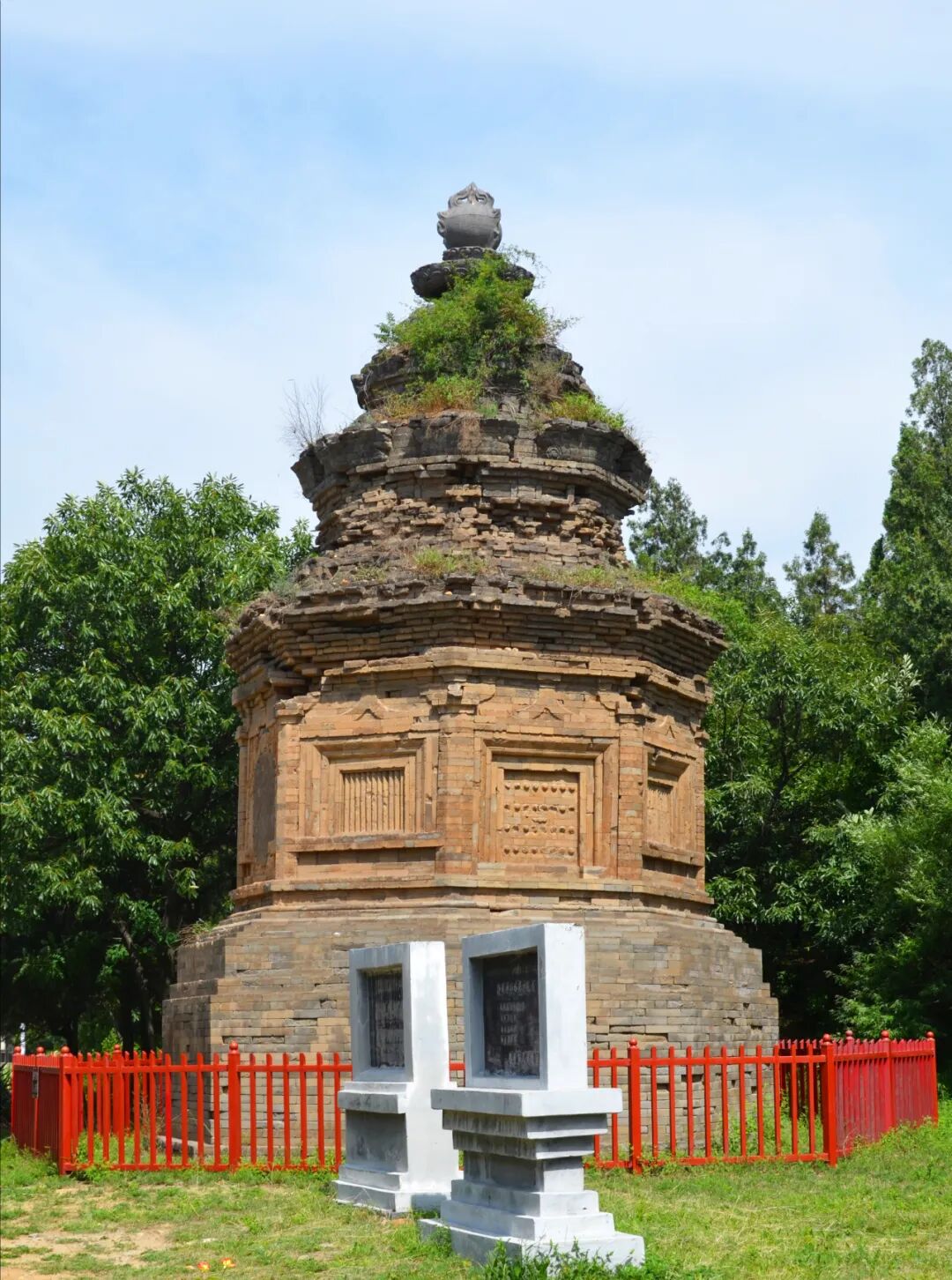 首先,云岩寺塔的八角平面虽有前例可循,但即使算上单层佛塔,吴越之前也仅有唐代一例,即天宝五年(746)河南登封会善寺净藏禅师砖塔(图8)。在佛塔普遍为方形的唐代,净藏禅师砖塔的形制无疑是具有突破性的。同样具有突破性的还有贞元九年(793)山西运城泛舟禅师墓塔,圆形平面砖构。但这两种样式在唐代都是孤例,也均为墓塔,特殊的平面形状是否与其功能相关尤待考证。可以确定的是,这两座墓塔的平面形状并非为结构之需。两座墓塔残高都在10米左右,高于10米的方形墓塔不在少数,如山东历城神通寺四门塔(611年)通高15.4米,明显高于这两座墓塔,因此可知单层佛塔不需要为了追求高度而改变结构。