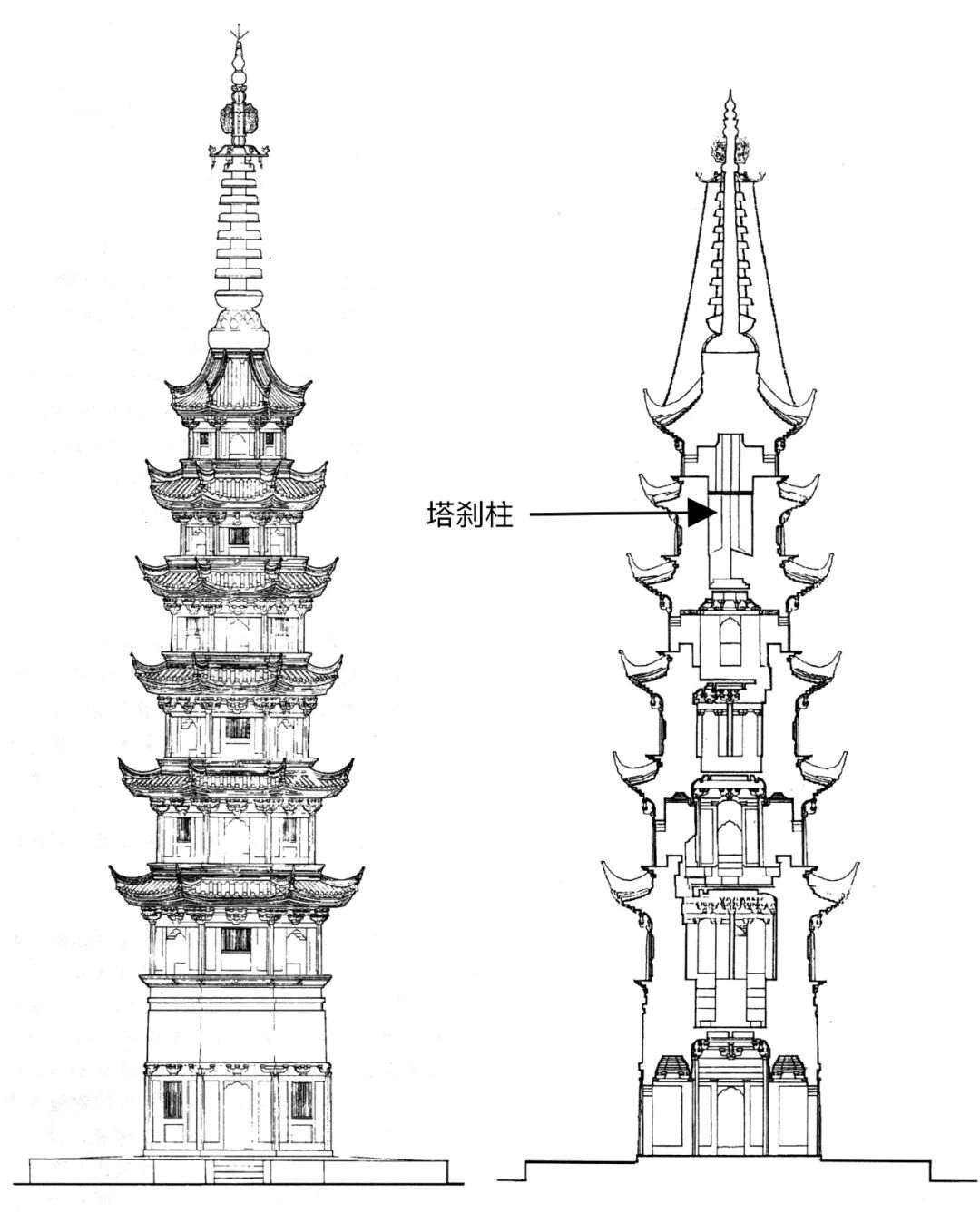 图10 苏州罗汉院双塔(982年) 正立面与剖面图
