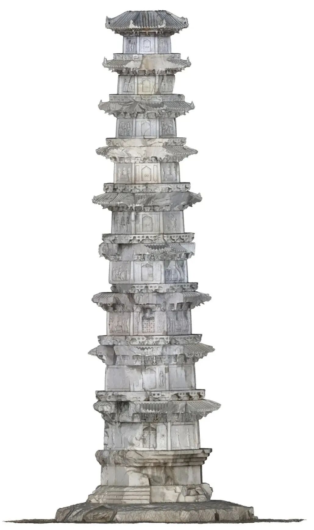 闸口白塔所采用的视觉语言和对于佛塔材质的想象,应放置在大的历史背景中理解,而它的特殊尺度亦是服务于这样的视觉想象。之前提到盛唐时期出现一波建造密檐式小石塔的风潮,最特别的是,这批小石塔在塔基之上的一层塔身做缩微佛塔形式,其上则放置多层塔檐,模仿密檐砖塔结构。相较真实密檐式塔动辄数十米的尺度,这类小石塔高度仅2~4米,最高者也仅7米左右。然而,塔身的刻铭对塔的描述却丝毫不局限于小石塔的实际尺度。山东青州段村石佛寺的天宝二年(743)杨瓒造像塔(图42),残高263厘米,修复后总高350厘米。塔铭描述建塔的过程时,却将之形容为高耸入云的大塔: