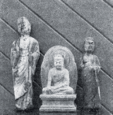 图38 瑞光塔底层东壁内发现的僧形木俑(左、右两尊)