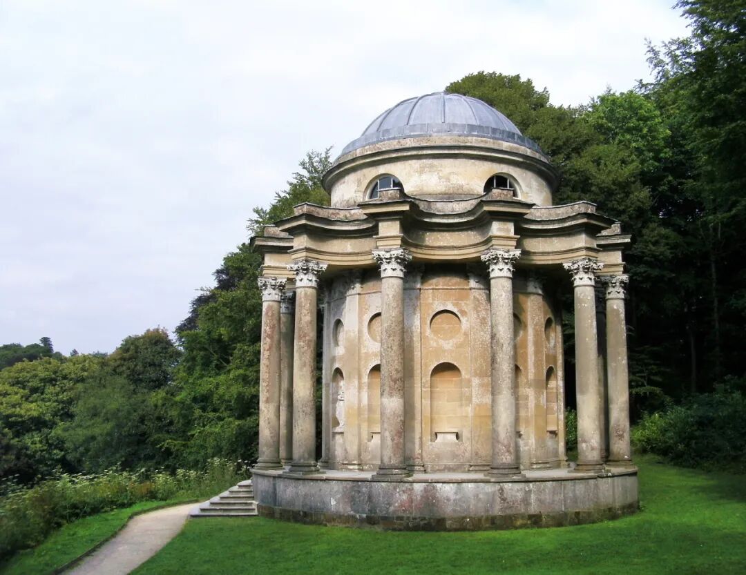 湖泊居中,湖畔青丘起伏,斯托海德花园的格局大致已成;依丘傍湖,几种标志性建筑次第出现。最先建成的是花神庙(1744—1746),位于湖东岸;虽是供奉百花与春天女神的庙宇,却有一个阳刚的多立克式四柱门廊(图7)。几年后,西岸建起了万神庙,它是斯托海德花园最大的建筑,摹仿罗马万神庙,但门廊改成了六柱式,两侧向外延伸,挡住了圆形的庙墙(图8)。庙内摆满古代神灵的大理石雕像,其中最为人称道的是佛兰德雕塑家里斯布拉克(John Michael Rysbrack)创作的大力神。伯灵顿勋爵建在奇斯威克的那座著名的帕拉第奥式住宅(Chiswick House)里有一尊帕拉第奥像,也出自这位雕塑家之手。