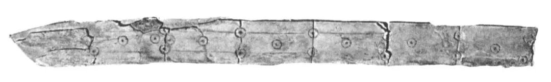 “对分制”的产生有其量划工具的根源。例如,日本大宰出土的唐木尺,其上寸以下的单位,乃将一寸均分为四等分,标至0.25 寸。这就是1/4、2/4、3/4 寸这样的刻度,较0.2、0.3 寸出现早和使用频繁的原因。中国境内也有相关实例,例如1955 年河南洛阳岳家村东汉墓出土骨尺,“残存七寸有余,两个圆圈表示寸,一个圆圈表示半寸,五寸处用圆圈组成十字。以五寸长11.9厘米推算,一尺合23.8 厘米”。(图3)又如,在1921 年河北钜鹿北宋故城出图木尺(32.93厘米),最小刻度也为半寸(图4)。值得注意的是,在国家计量总局发行的《中国古代度量衡图集》中早期竹尺、木尺大多刻度只到1寸,也有少数刻度到0.5寸,到了后期有分刻度的营造尺实物才逐渐多起来。