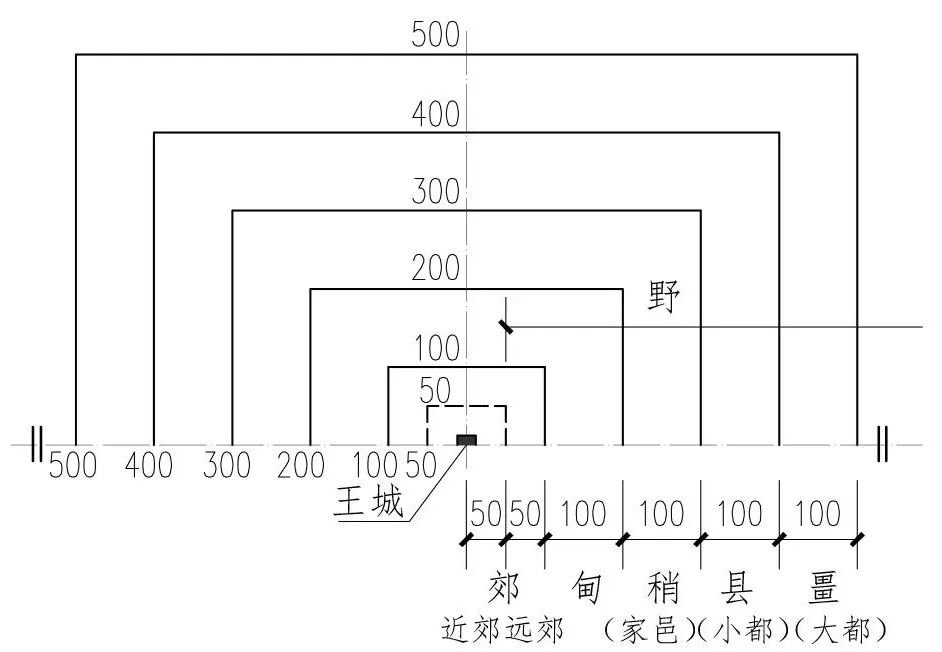 人们为了施工、记忆方便和避免反复换算出错,往往根据测量对象的大小来设置合适的参照,即“各因物宜为之数”。具体表现在三方面:一是在单体建筑尺度方面,“尺”是常见的度量单位。在官式建筑和一些地方重要建筑的地盘合尺中,“整数尺”的手法在以往学者的研究中已经有较多讨论,具体包括开间、进深步架、檐柱高和脊檩上皮高度等部位,在此不再赘述。二是在大规模建筑群层面,根据傅熹年先生研究:“隋唐洛阳大内平面分析图,用方50丈网格为布置基准(1丈等于2.34米);明清北京紫禁城宫殿:外朝前三殿及皇城天安门至午门总平面图以方10丈网格为布置基准(1丈等于3.19米);北京明清太庙平面则是采用5丈网格基准(1丈等于3.19米);浙江省东阳市卢宅用方3丈网格为布置基准(1丈等于3.19米)。苏州铁瓶巷颜宅平面以方2 丈网格(1丈等于3.2米)布置基准。”三是在“王畿(古指王城周围千里的地域)”范围,根据贺业钜先生研究,《周官》中王畿分区轮廓图是按照100里的理想模数进行规划,以王城为中心,逐步向外依次称郊、甸、稍、县、畺、野等用以安排不同功能的农田和建筑(图1)。《春秋榖梁传》记载:“古者,三百步一里,名曰井田。”东周尺长为23.1厘米,一步为六尺。那么1 里=0.231米×6×300=415.8米。“王畿”的尺度模数应是41.58千米。