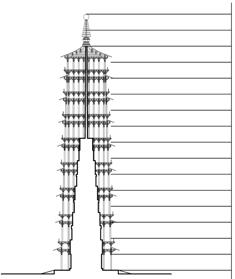然而,笔者对上述研究仍存一些未解疑惑。经过若干年反复思考,愈发觉得这座历史高塔各层比例及其中可能蕴含的象征意义,仍有进一步发掘之必要。即使不是为了建造性重现,仅从学术研究角度出发,仍有必要对自己之前研究作进一步修正,以期对永宁寺塔可能原状再作一点更为深入的探索。此乃本文主旨所在。