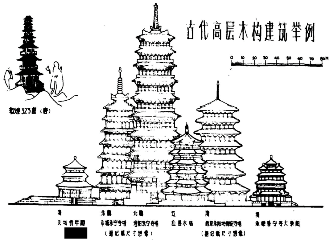 经历多年岁月变迁与居所迁移,笔者20世纪80年代初那份几乎被遗忘的手写稿及在脆弱硫酸纸上颇费时日绘制的想象性透视草图,已不知所踪。这一研究的唯一痕迹,仅见于本人80年代有关古代高层木构建筑研究中所绘一张北魏洛阳永宁寺木塔与史载北魏平城七层塔、唐代长安禅定寺塔,及应县木塔、天坛祈年殿、承德永宁寺大乘阁等高层木构建筑高度与体量比较图中(图1)。