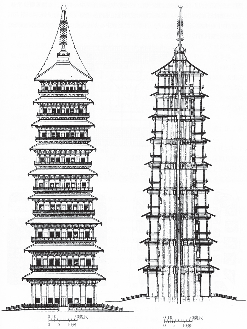 遗憾的是该文未给出各层柱高、铺作及平坐具体尺寸,只提到二层以上,“每层二丈八尺”的估算数值,可知其二层以上诸层,采取同样层高处理,此与同时代中、日、韩古塔层高逐层递减造型韵律,亦似有悖。同时,这一复原另有一存疑之处:首层塔高。如作者言,《洛阳伽蓝记》提到“举高九十丈,有刹复高十丈,合去一千尺”,“这个数字显然是以‘十丈’为单位,九级就是‘九十丈’。该书作者杨衒之忽略了塔的逐级收缩,而粗略地估计了塔的第一级为十丈后乘以九而得出的数字”。基于这一判断,首层塔高宜接近北魏尺10丈(27.29米)(图4)。这一猜测性判断,本身并无不妥。但当时南北隔绝,距洛阳较近的华北、关中地区大型木材来源已显匮乏,若用如此多高达20余米的粗大原木,无疑会极大增加木材寻找、砍伐、运输难度,增加施工困难。当时的设计与建造者当不会忽略这一问题。