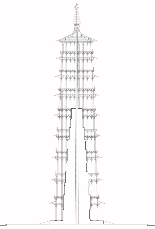 由此可知,以乾隆年间残存土堆体量推测,若基底为20米见方,其土坯中心柱高度不会超过60米,即约至第六层塔地面,已达极限。六层以上塔身,可能采用普通的木构塔身辅以中心木柱,结构形式与曾受南北朝影响的日本飞鸟时期木塔做法更为接近。