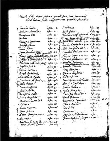 斯卡莫齐的大部分私人藏书很幸运地被保留下来,收藏在美国哥伦比亚大学的图书馆中。根据2014年哥伦比亚大学的伊萨德(Katherine Granham Isard)博士基于这些藏书完成的博士论文的研究,从斯卡莫齐在书中的大量批注,可以看出他对前辈理论的态度和吸取。图8是他1586年整理编纂的所藏古代著作的作者清单,可以看出他涉猎之广泛。这些都深刻影响了他的建筑思想。