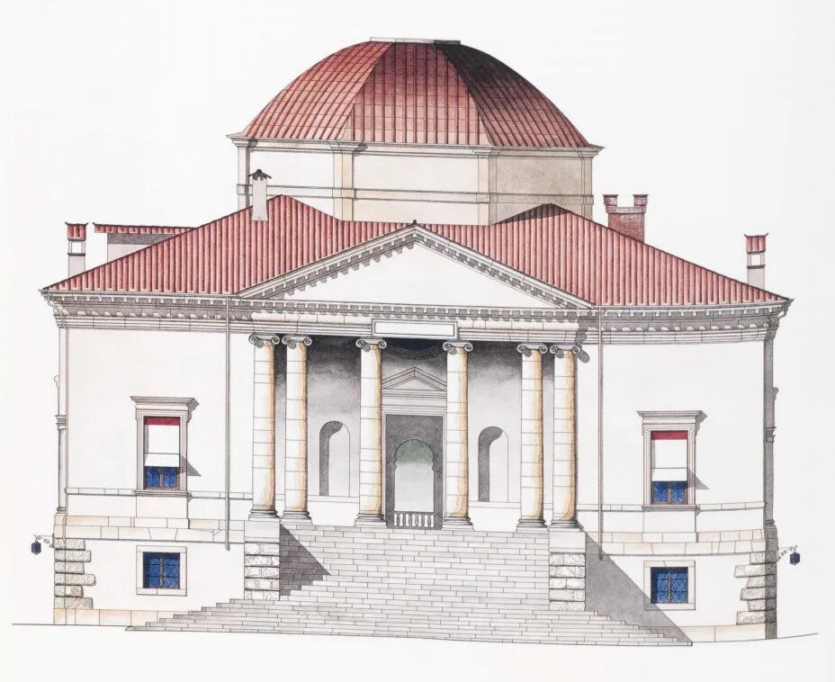 这种影响在皮萨尼别墅和圆厅别墅的对比中非常明显。从体量组合、立面构图、平面形式中都可以明显感觉到二者之间的联系和相似性。不过,决定性的差别也从这种相似性中开始产生。