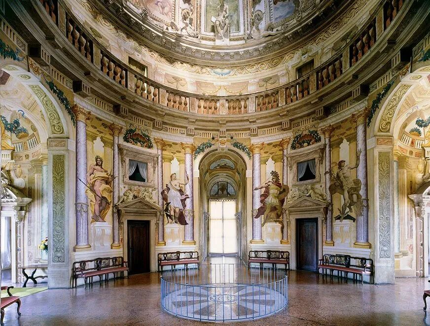 如果说圆厅别墅是宇宙秩序的某种“再现”的话,皮萨尼别墅则是关于宇宙的“知识”的星盘:它是展示别墅所在地理的指针,是风向和光线的合奏。如果说圆厅别墅“辉煌但不适宜居住,是给神住的房子”,那么斯卡莫齐的作品则是理性的“人类居所”。