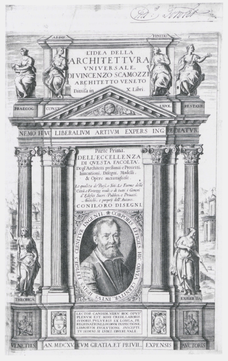 在意大利文艺复兴建筑师的写作传统中,从15世纪的阿尔伯蒂,到16世纪的塞利奥、帕拉第奥、维尼奥拉一路而来,斯卡莫齐接续其后,在知识储备和精神方面集前人之大成。斯卡莫齐的《一种普适建筑的理念》(1615年)是这一传统最后一部建筑学专著(treatise),对与建筑有关的所有理论和实践问题作了包罗万象的介绍。在斯卡莫齐之后是更加激进和具有现代性的洛多利(1750年)和米利扎(1780年),斯卡莫齐可谓导夫先路。而在同时代的法国,17世纪已经是开风气之先的佩罗(Claude Perrault,1613—1688)时代了,再往后,洛日耶所代表的那种彻底的启蒙精神呼之欲出。