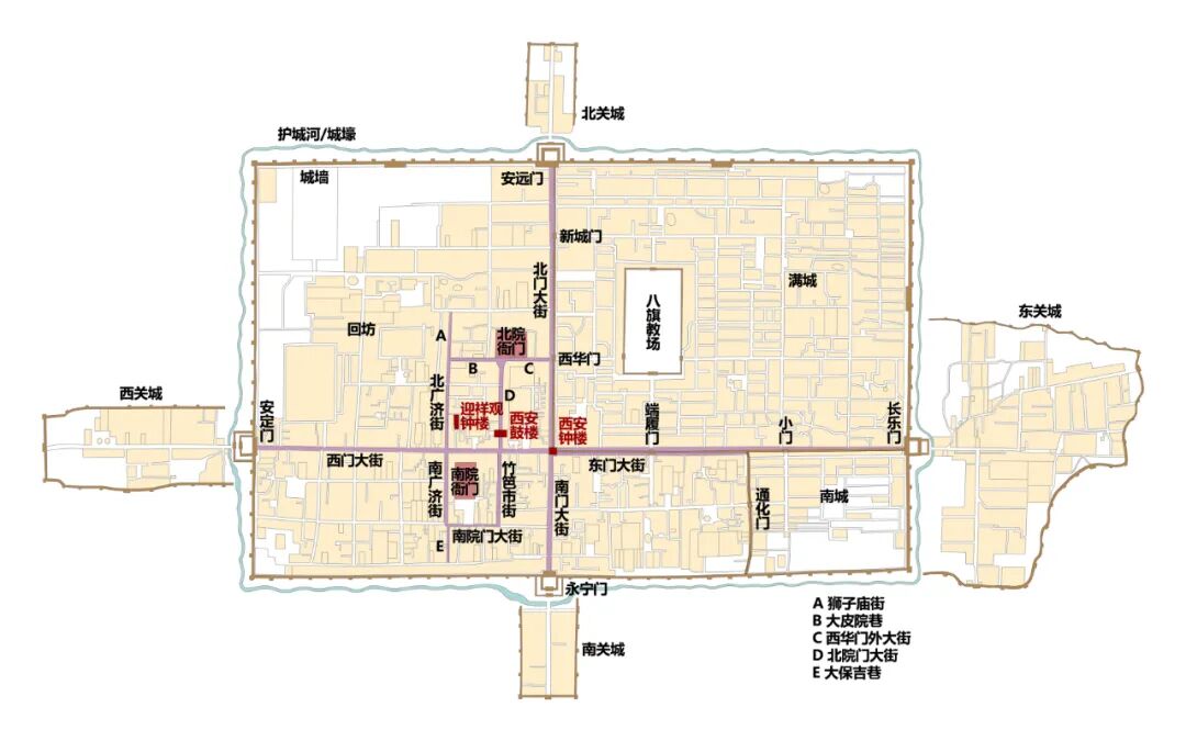 关于迎祥观钟楼、西安钟楼对于城市结构的控制,笔者认为:一,明初时期新扩展的城内东部人口、活动、建筑尚且空乏,因而洪武十七年(1384)仍然在偏西的广济街旧轴线处营建迎祥观钟楼来为全城授时。二,历经两个世纪的发展至明朝中后期,城内东部已经较为充实,新南北轴线的实际效用已然稳固取代旧轴线,迎祥观钟楼所处位置此时显得过于偏西。因而万历十年(1582)在城内东西南北大街的交汇处新建西安钟楼。三,西安钟楼绾毂东西南北四向,在塑造城市形态与肌理层面发挥着宛如拱心石一般的决定性作用。需要强调的是,西安城以西安钟楼为核心、东西南北四条通达城门的大街垂直正交于此并担当城市轴线的格局直至明朝中后期才完全形成,并非通常认为的明朝初期。城市结构的调整变化显著滞后于城垣范围的扩张。四,自唐末封闭朱雀门使得全城南北中轴线模糊、格局失焦,历经五代宋金元之后,直至明代南(门)大街—北(门)大街成为新的南北中轴线,城市结构才再次变得清晰明确。唐末以至明清城市格局的变化是逐步发生的,其中有若干标志性事件,西安钟楼的营建完成最终确认了南北中轴线的迁移。