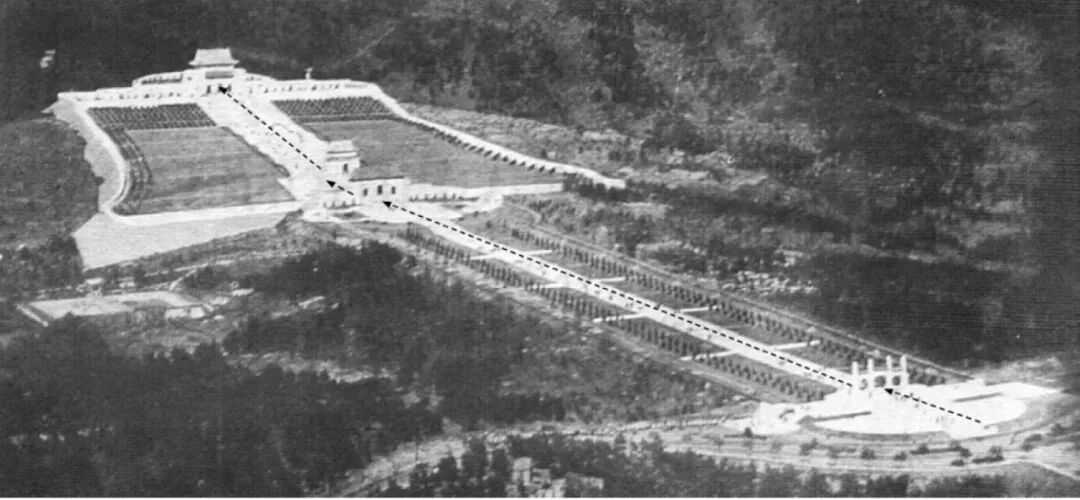 中国近代建筑师在总图和单体平面设计中也常常体现帕拉第奥崇尚的轴线、对称、秩序等古典原则,并成为一种普遍现象。以中山陵为例,从总平面的布局来看,牌坊、陵门、碑亭、祭堂与墓室五组主体建筑沿一条南北轴线对称布置,这种布局形式虽然也符合中国明清皇陵组织方式,但如果从视觉上分析就会发现其中还蕴含了以透视为基础的轴线体系(图9)。“透视法”是文艺复兴的产物并被继承到“布扎”教育体系中。这种基于西方透视法的轴线组织体系很好地加强了祭堂的重要地位,使其成为建筑群中最为庄重的存在,吕彦直显然是了解并运用了它。