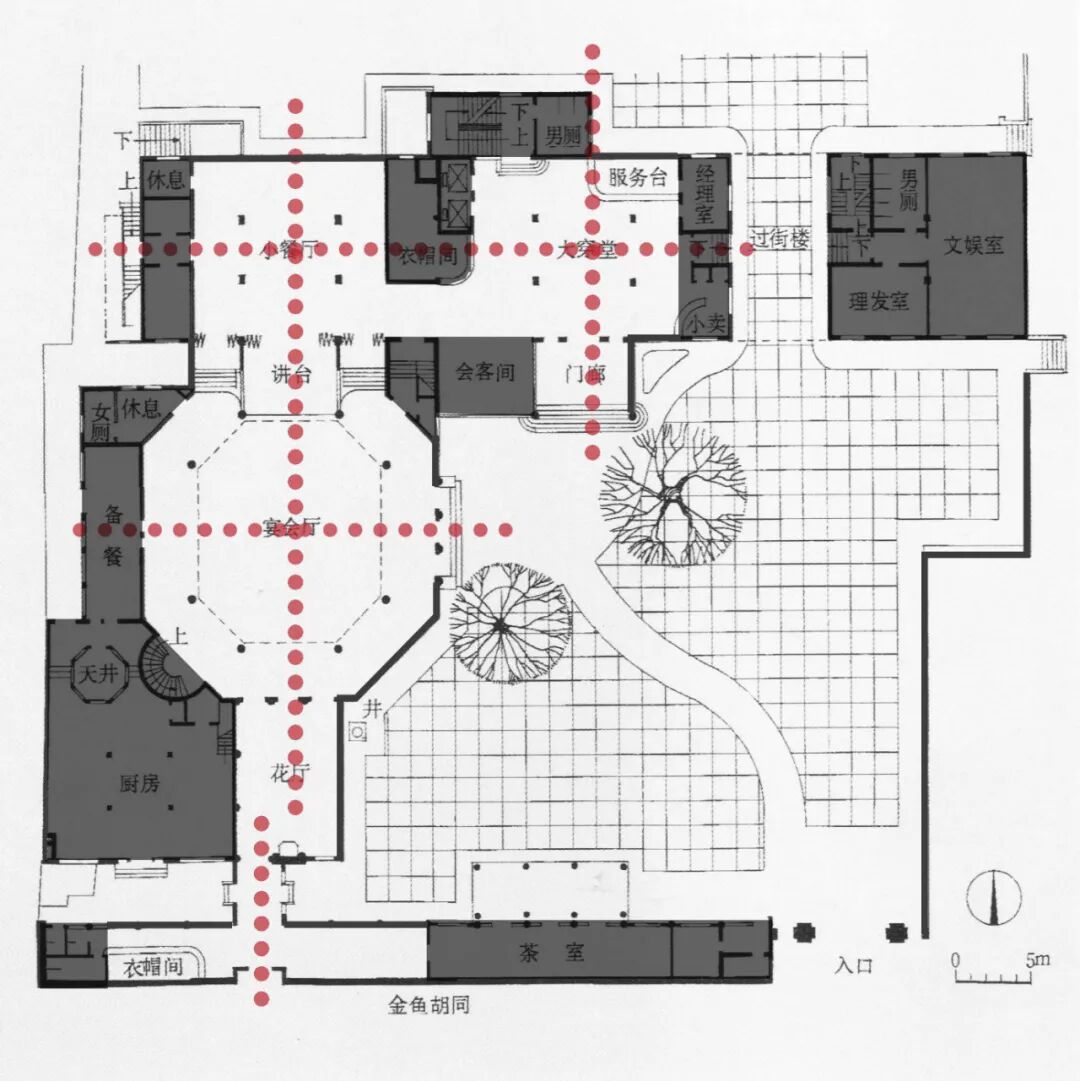 但随着国际式和现代主义的传播,近现代建筑设计中整体不对称的情况越来越多,但这并不意味着轴线和秩序的缺失,古典美学依然根植于建筑师心中。1952年建成的北京和平宾馆被认为是新中国成立后包豪斯式现代主义创作的典范,但仅从风格上来解释或将其归类可能是一个误解。顾大庆分析后发现,和平宾馆依然采用了很学院派的方法:用轴线组织平面,主要空间之间以一个次要的过渡空间相连,用空间的限定来思考功能关系。“布扎”出身的建筑师们,始终没有忘记运用几何的控制线、比例、大小、尺度,去控制“局部”凑在一起的关系,并用poché 的图底表达手段清晰地呈现出来(图10)。这种手法使外表看似自由、不规则的现代主义式平面呈现出古典均衡完整的构图。