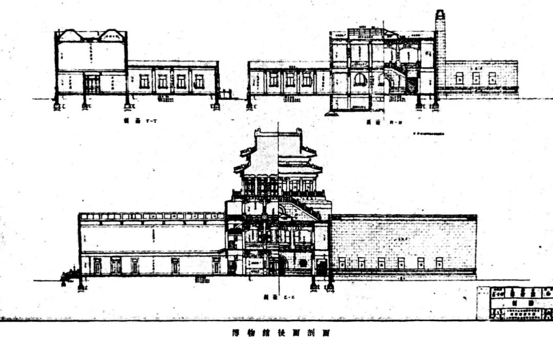 在帕拉第奥的《建筑四书》中还出现了将立面和剖面组合的图纸表达方式,如那张著名的圆厅别墅图版。这使得建筑外部特征和内部结构形成直接明了的对应关系。梁思成在五台山佛光寺大殿的测绘图中就采用了这种剖、立面结合的方式,这在之前的中国古建筑文献中是从来没有出现过的。右侧西立面展现了立面特征,包括鸱尾、仰覆板瓦屋顶、铺作设置、门窗样式等细节。左侧剖断面则再现了内部精巧的屋架结构和室内佛像(图14)。“大上海计划”中由董大酉设计的上海市博物馆,在绘制剖面时,建筑师采用了两个折剖的手法。以乙- 乙剖面为例,除了可以看到建筑结构还可以对应看到立面的处理(图15)。