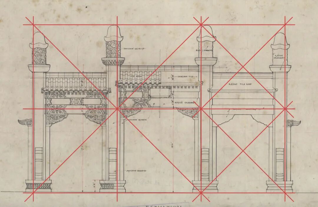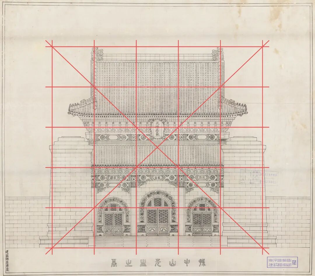 20世纪留洋的中国第一代建筑师们经过以西方古典建筑体系为基础的教育洗礼后,他们在中国的实践有意无意地坚持着“布扎”所强调的古典原则和审美。其中,杨廷宝是出类拔萃的一位。20世纪30年代初他的作品就“做出了合理的功能布局,协调的建筑体型和统一的比例尺度”。赖德霖认为,杨廷宝建筑创作具有表面折衷和内在统一的双重性,后者则来自于:他会用一种或多种比例取得立面整体协调的效果,而黄金分割与3∶5等经典比例会贯穿于他风格各异的设计中。如果以“规线(regulating lines)”进行分析上述论断就会一目了然。类似做法也同样出现在梁思成、范文照、董大酉等“布扎”出身的建筑师作品中。他们都在努力寻找出一种易于理解的建筑长宽高的关系,以获得建筑亘古不变的美。