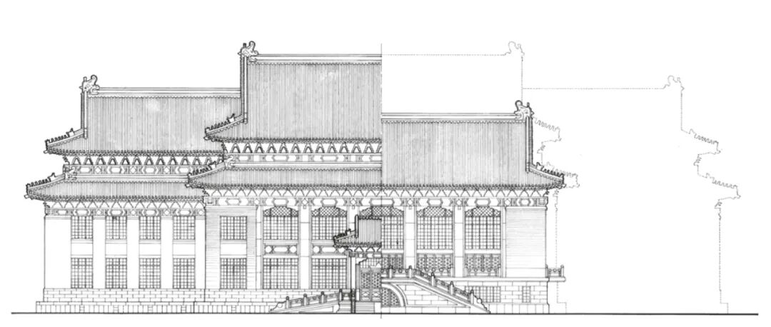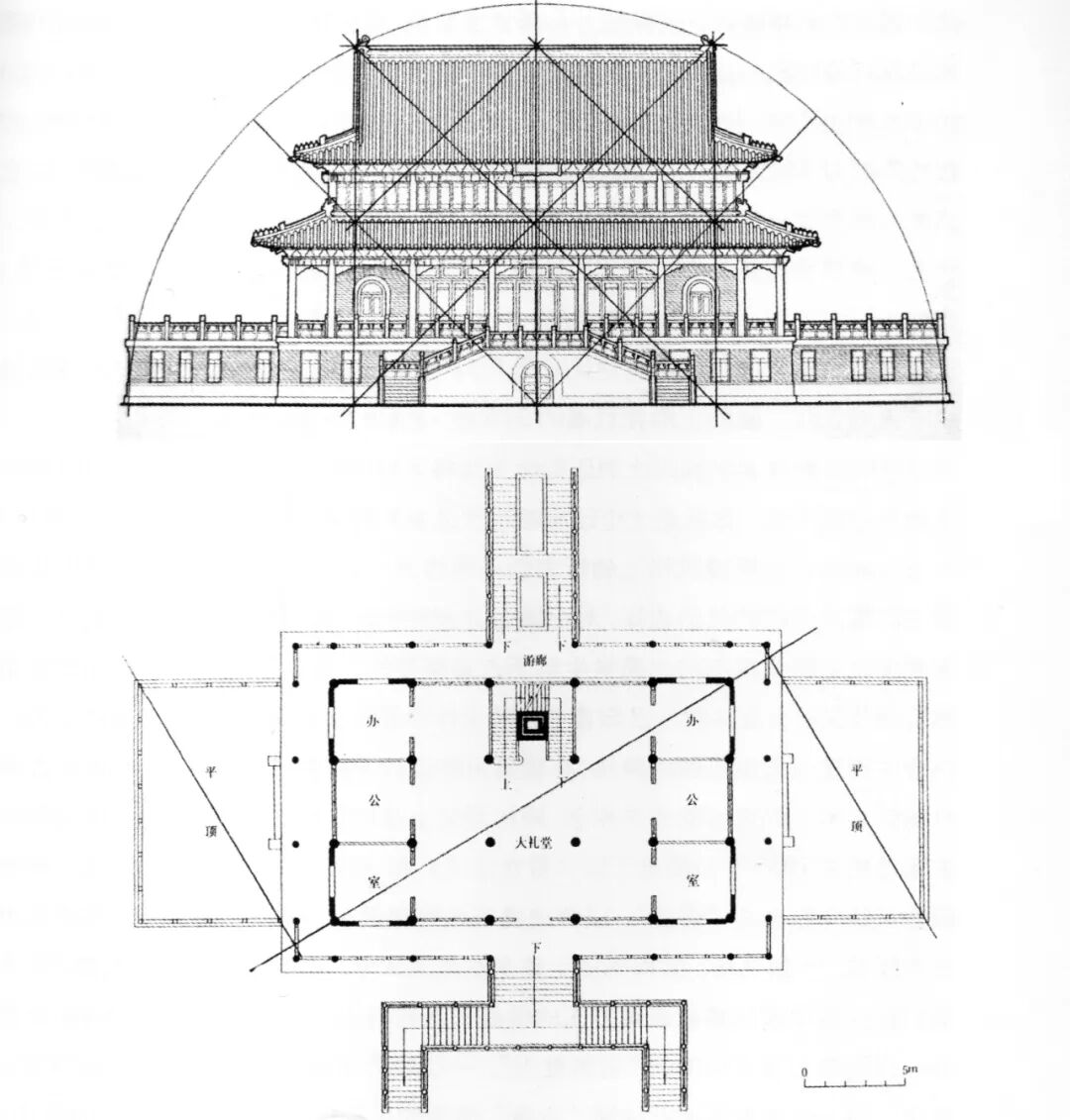 但“布扎”训练和中国实践的关系又是互动的,既有“布扎”方式对中国传统建筑形象和建造技术的改造,也有中国社会与文化氛围影响下建筑师对“布扎”思想的修正。例如我们会关注,中国建筑师是如何以帕拉第奥式的古典比例去规范中国传统风格新建筑的造型。赖德霖曾用形式分析方法研究过杨廷宝在南京设计的一处重要的“中国固有形式”建筑——中国第二历史档案馆。通过调整传统殿堂建筑的重檐间距和平台等做法,在立面上获得一种西方古典式优美比例的构图;不仅如此,建筑平面柱网和平台矩形平面比也是3∶5 这一经典比例(图4)。稍早时期吕彦直、董大酉、范文照、赵深等人创作的民族风格建筑也存在类似构图。