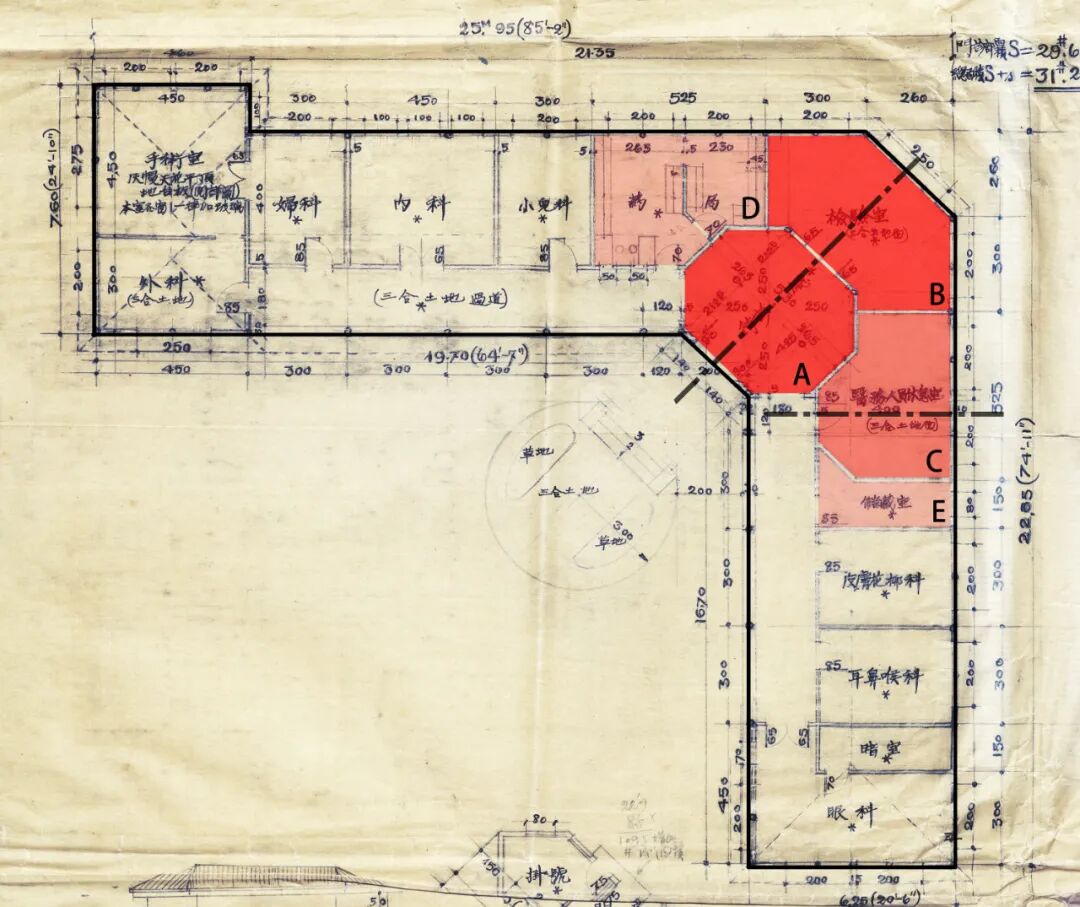 这是一座单层坡屋顶建筑,平面呈“L”形,一翼为药局、小儿科、内科、妇科、手术室和外科;另一翼为医务人员休息室、储藏室、皮肤花柳科、耳鼻喉科、暗室及眼科,以半室外走廊连接。建筑师将八边形的入口门厅(A)设置于“L”形转角处,其后方安排检验室(B),这两个主空间被串联在建筑主轴线上,严格对称。(C)为医生休息室,因与(A)空间斜向45度相接,建筑师就将其入口对侧墙也旋转45度,保持门两侧空间对称。这也导致了相邻的储藏室(E)呈矩形加小三角这样奇特的平面形状,但若基于(C)空间重要性的判断,就可理解建筑师的这一处理。(D)为药局,室内隔墙也做成旋转45度,以呼应另一侧的格局,同时也避免产生难用的锐角空间(图11)。虞炳烈遵循了秩序的某些标准,优先保证重要空间的对称与完整,距主轴线越远,空间重要性越低,便可做出牺牲与调整,从而形成非匀质、分主次的规整平面,这是第一代留洋建筑师惯用的形式操作手法,也是建筑师职业技巧和对建筑良好品质的一种追求。