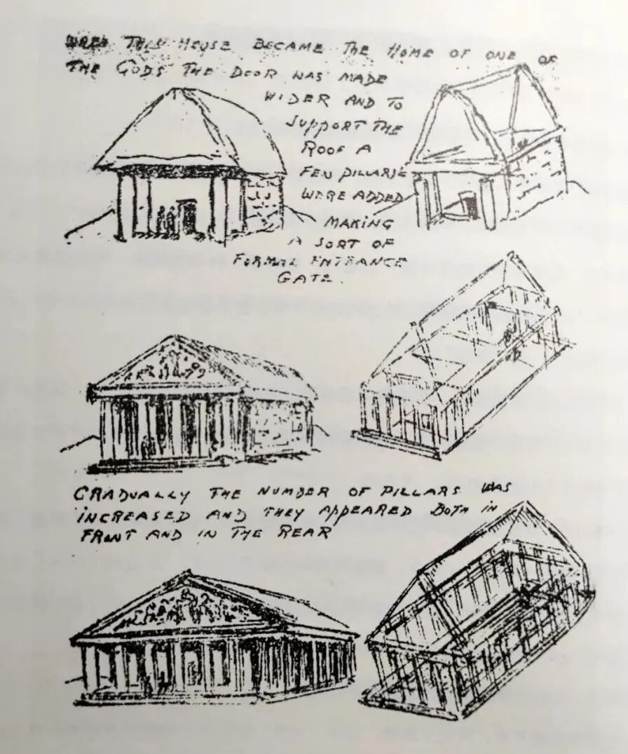 高等级的建筑并不是突然出现的,是从简陋的原初状态逐渐演变而来的,所以在各种不同文化的高等级建筑物上,往往都会保留有其原始房屋的某些痕迹。在笔者的一本书中列出了一张图(图2),表现的正是古希腊神庙是如何从其早先那粗糙的房屋形态中逐渐演变而来的。这是一张很能说明问题的希腊建筑发展示意图。