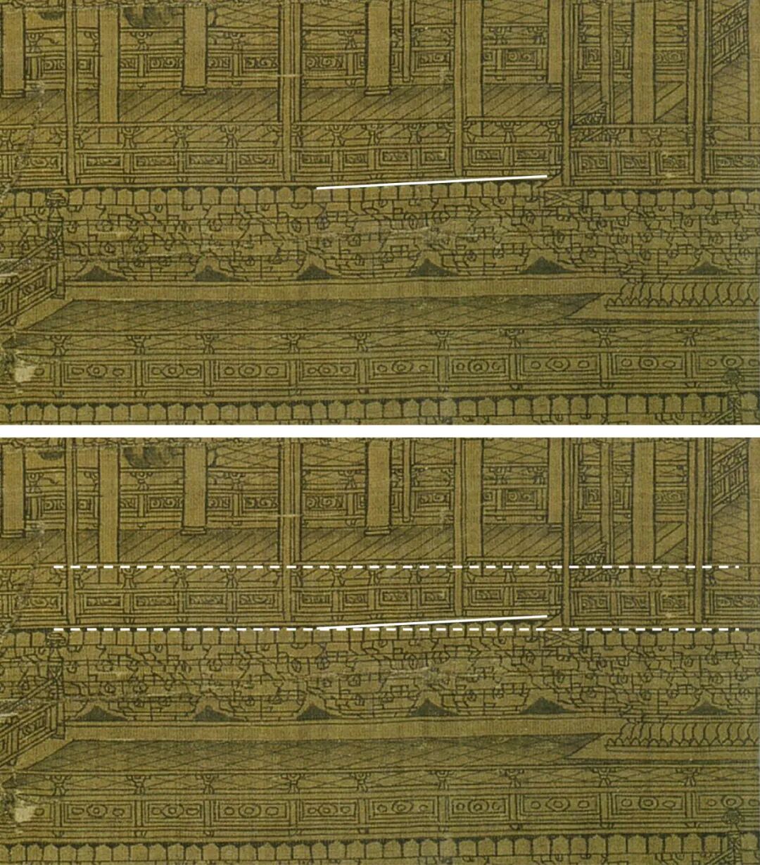 关于界画如何控制画面尺寸,邓椿在《画继》里有一句话很值得琢磨:“郭待诏,赵州人,每以界画自矜,云置方卓,令众工纵横画之,往往不知向背尺度,真所谓良工心独苦也,不记名。”“置方卓”是否可以被理解为是画布上布满网格?但是,《明皇避暑宫图》中的一处画法错误至少明显暴露了界画创作中参考线的存在。