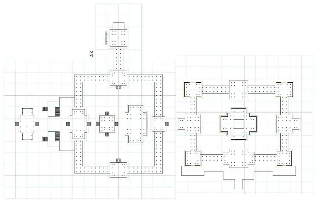 遗址是建筑曾经存在的确凿物证,也是复原研究最直接的支撑,遗址可以确定建筑的基址规模及可能完整的单体柱网尺寸。文献记载是建筑曾经存在的旁证,正史、地方志以及碑刻记录了为数众多的建筑信息,其中一部分还附有珍贵的配图。在此基础上,通过特定时期建筑的法式规律,便可以复原出在理论上接近历史真实的建筑形象。
