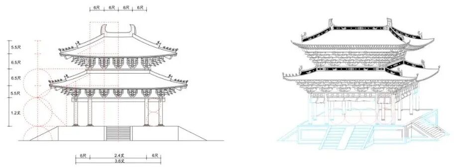 遗址和文献复原研究的起点都是历史残留信息,这种从局部推测整体的研究之所以在理论上成立,很大程度上依赖中国传统建筑自身建构上的逻辑规律。从《营造法式》(下文称《营造法式》或《法式》)的相关规定和法式研究的诸多成果来看,中国古代建筑的构件之间有着微妙的比例关系,如《营造法式》“看详”曰:“举屋之法:如殿阁楼台,先量前后撩檐枋相去远近,分为三分(若余屋柱梁作或不出跳者,则用前后檐柱心),从撩檐枋背至脊槫背举起一分(如屋深三丈即举起一丈之类)。”单体建筑内部依靠各种比例关系建构成一个整体,大小建筑也通过比例关系相互协调构成和谐的群落。因此,如果知晓其中某些控制性构件的确切尺寸,便可以在比例关系的指导下,通过几何作图画出整座建筑的图样。