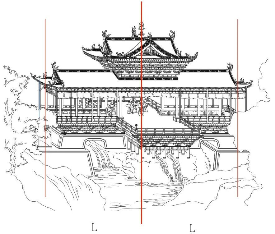若以火珠为基准,画一条垂线,会发现画面上的平坐角柱、后方露台栏杆转角等都在这条直线上,两端最外侧的角柱,与这条参考线的距离也刚好相等(L),这应该不是偶然(图33)。