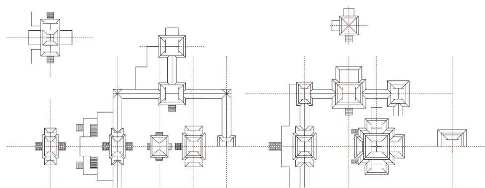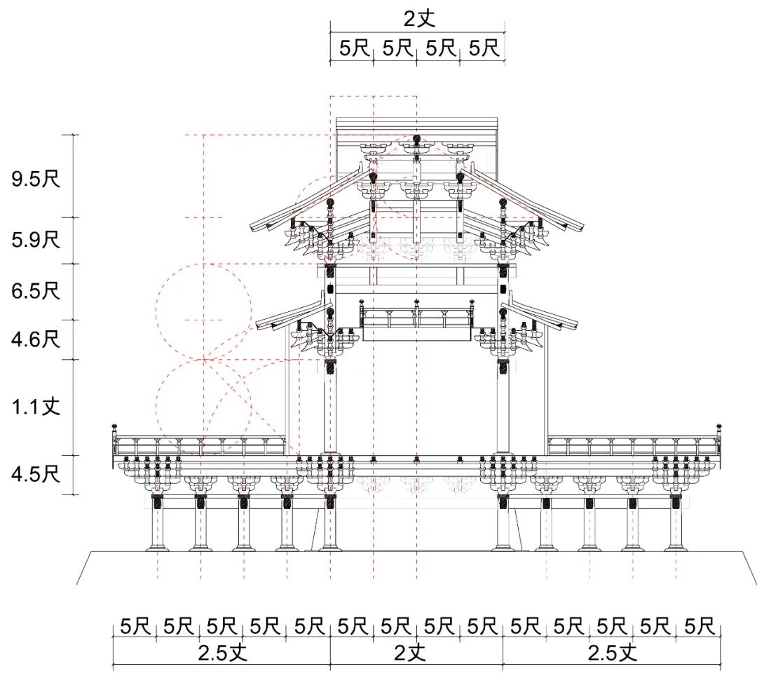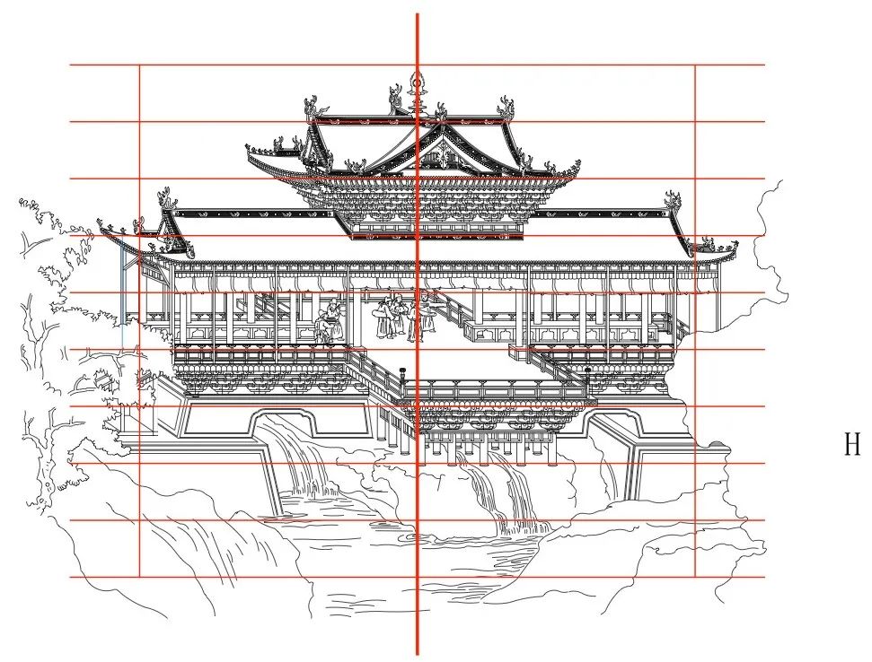 以火珠顶端到正脊的高度为单元(H),向下复制水平参考线,水榭的十字脊檐口、额枋,下檐卷帘、平坐栏杆、墩台上皮、平坐短柱柱础等,都落在这些参考线上(图34)。