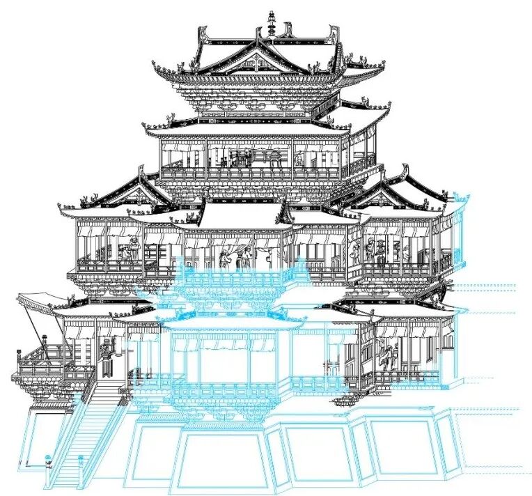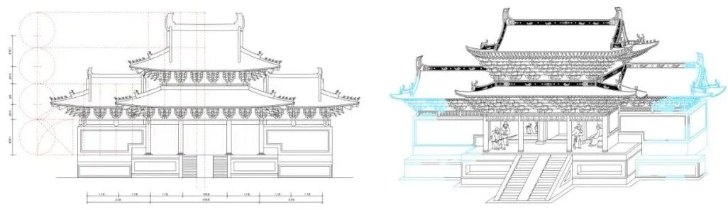 既然界画不是随性挥洒的艺术创作,而是类似于借助工具的“工程制图”,那么原则上来说,比对画面尺寸和设计尺寸之间的数值关系,可能是找出折算规律的一种有效方式。画面尺寸可以从画作原件上量取,设计尺寸则需要引入界画复原研究。界画复原研究是指通过识读、分析和再设计三个步骤,用现代的图示语言将界画作品中的建筑形象还原出来。简言之,研究的目的是为了还原画师作画时头脑中所出现的建筑形象。