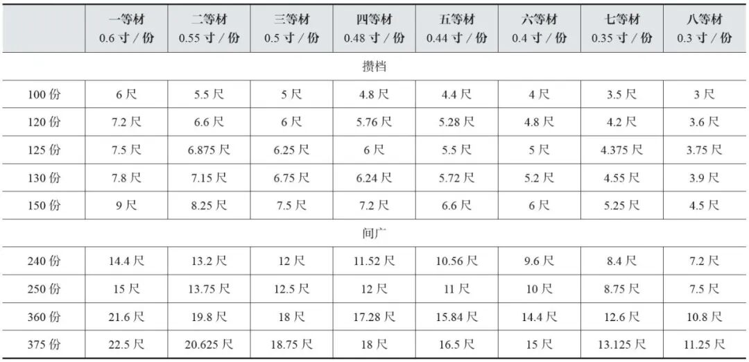 《营造法式》习惯用“材份”来标注构件之间的距离或大小,但是“材份”需要换算成“尺寸”才能直接指导设计施工(表1),傅熹年先生在《关于唐宋时期建筑物平面尺度——用“分”还是用尺来表示的问题》一文中指出:“宋式在确定八等材时,其中某些等第有可能是考虑到使其标准间广的份值与当时较常见的以尺计的建筑间广相适应而定的。”因此分析“材份”和“尺寸”的换算关系或可为材等的确定提供线索。鉴于攒档作为放大模数在确定平面尺寸方面的关键作用,可以先对攒档的尺寸关系做一个简单的梳理,攒档的标准长度为125份,在不同的材等下有不同的具体长度,具体对应关系如下。