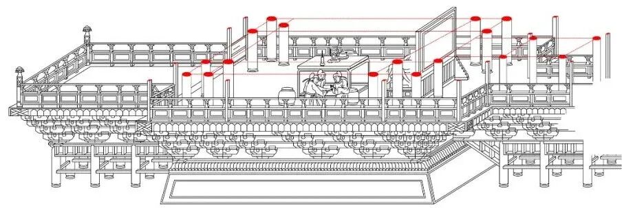 剖面设计上的另外一个难题是确定平坐加墩台的总高。《营造法式》中并无现成的尺度参照,考虑到古代匠人在设计房子的时候,并不会使用太复杂的比例关系,而是倾向于使用一些简明的参照来确定构建的尺寸。故尝试用檐柱高度作为一个扩大模数,使平坐和墩台的总高与檐柱高度相等,以此得出复原结果(图14,图15)。